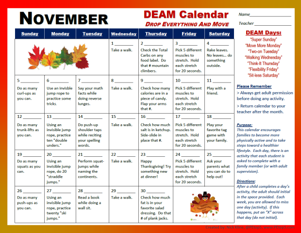 November’s DEAM Calendar Here is November’s DEAM (2017) Calendar Share this: Click to share on X (Opens in new window) X Click to share on Facebook (Opens in new window) Facebook Like Loading... Related