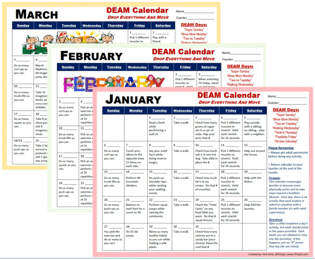 It is hard to imagine that the New Year is around the corner.  Here are the DEAM calendars for the next few months.  Distribute the calendars to students each month to promote family engagement and encourage more physical activity at home.