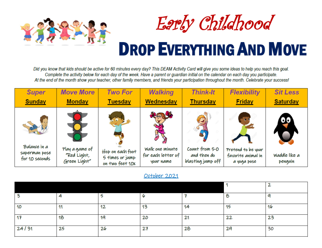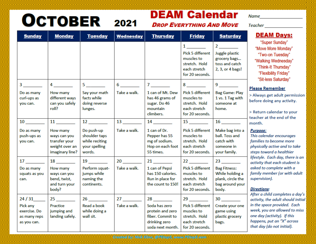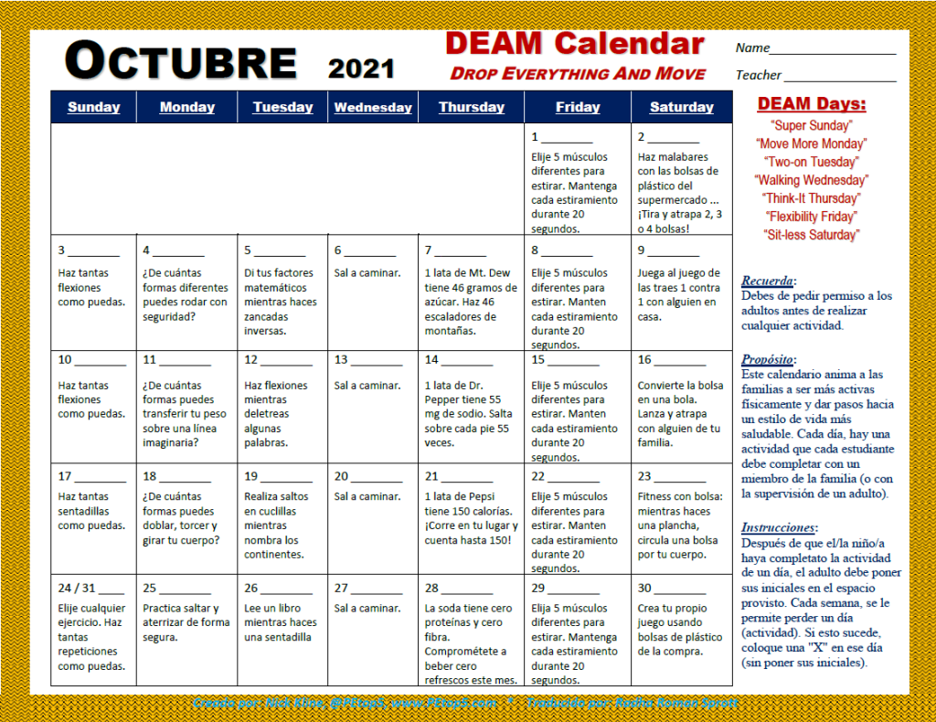 DEAM – October 2021 All four versions are back. Let me know what you think. Enjoy your October! Elementary CalendarDownload Elementary (Spanish) CalendarDownload Early Childhood CalendarDownload Advanced CalendarDownload Share this: Click to share on X (Opens in new window) X Click to share on Facebook (Opens in new window) Facebook Like Loading... Related