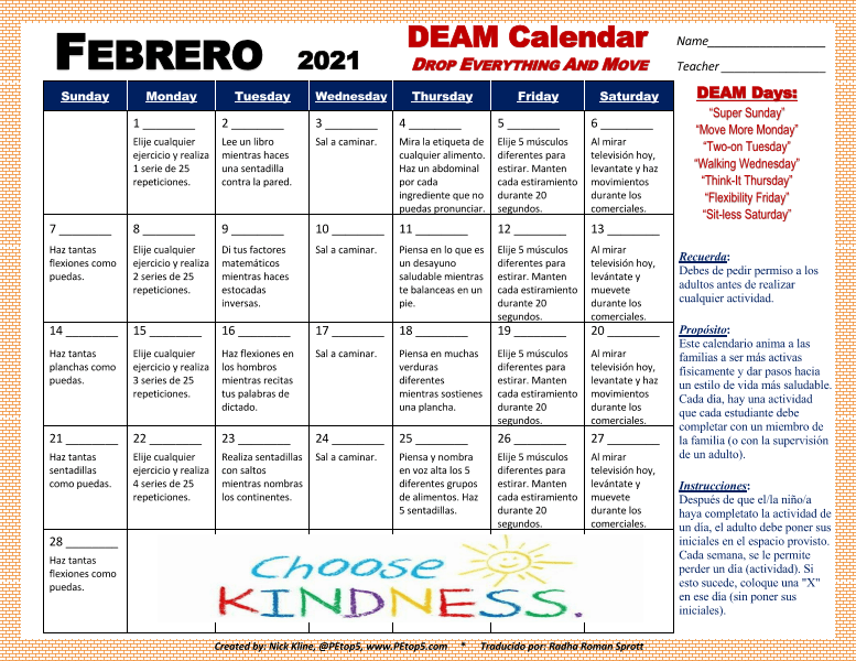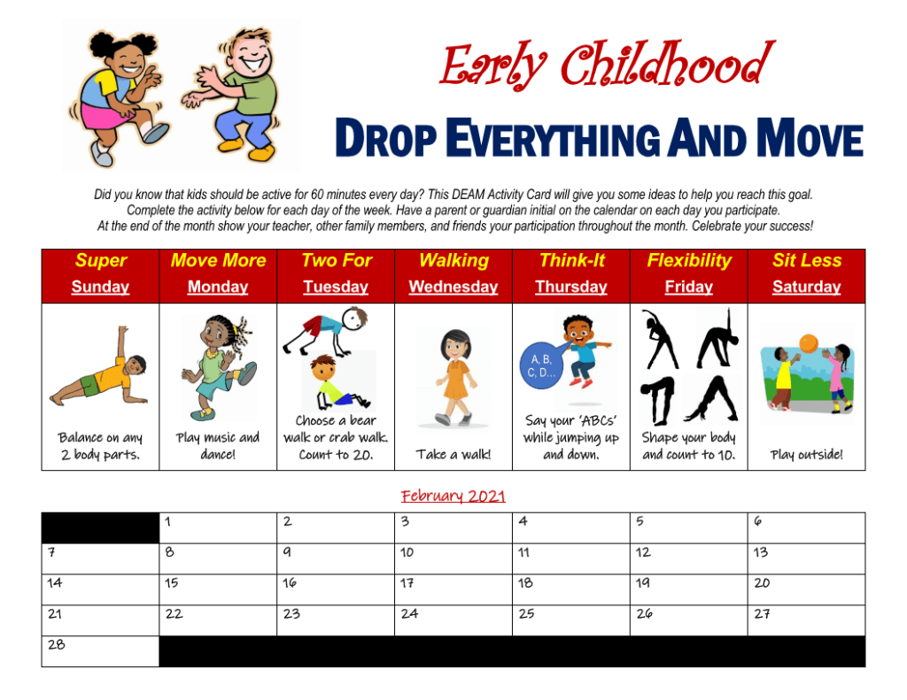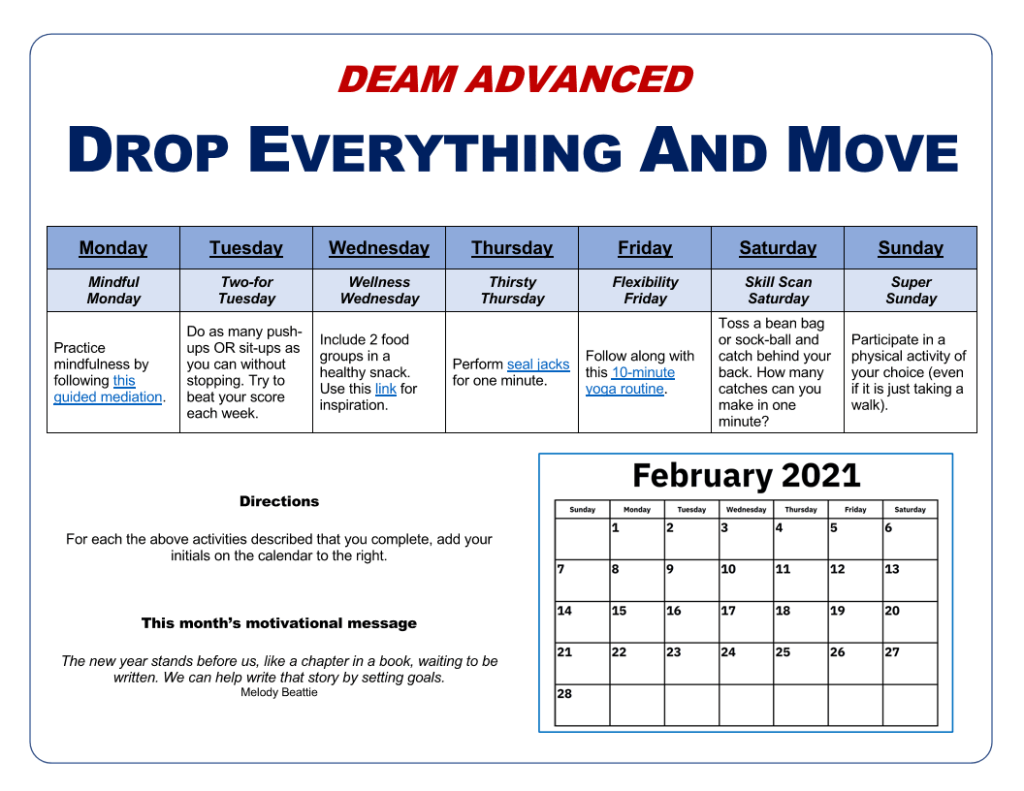February DEAM – All Levels! Drop Everytghing And Move has expanded to include students at ALL levels! DEAM Advanced (Middle and High School)Download Early Childhood DEAMDownload DEAM (Elementary Level)Download DEAM (Elementary) – SpanishDownload