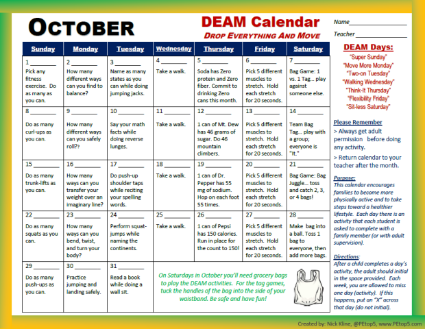 Here is the Drop Everything And Move (DEAM) Calendar for October. I encourage you to print it out and distribute to students to take home. At the end of the month, collect the calendars and give small prizes to those that participated… or give “extra” PE time to the class with the highest percentage of participants. Enjoy!