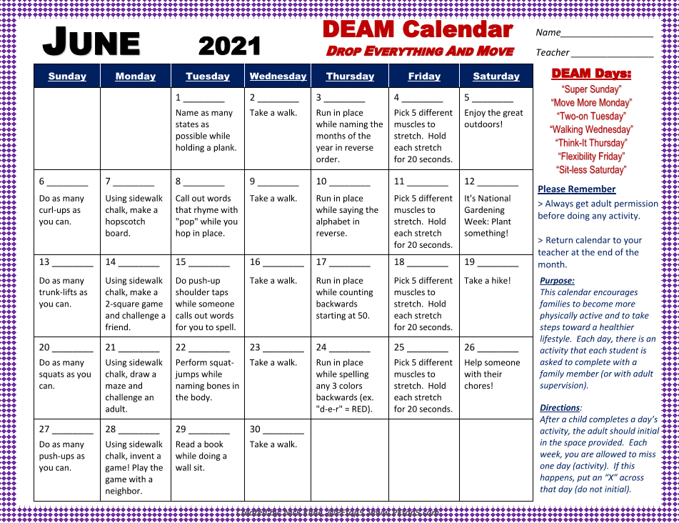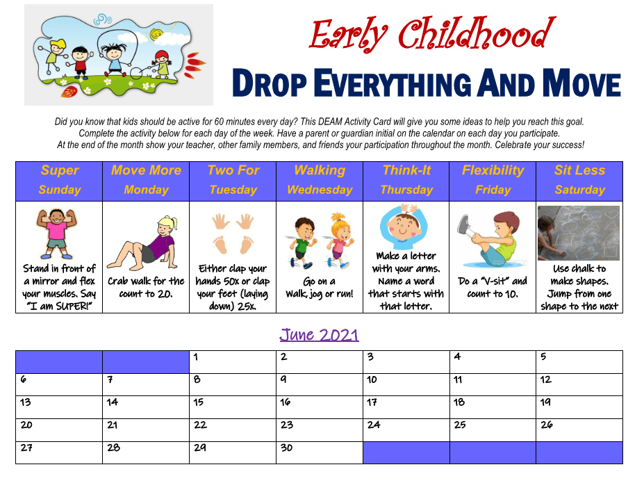 June DEAM Whether you are still in school or home for the summer, don’t forget to Drop Everything And Move! DEAM ElementaryDownload Early Childhood DEAMDownload Secondary DEAMDownload Spanish VersionDownload